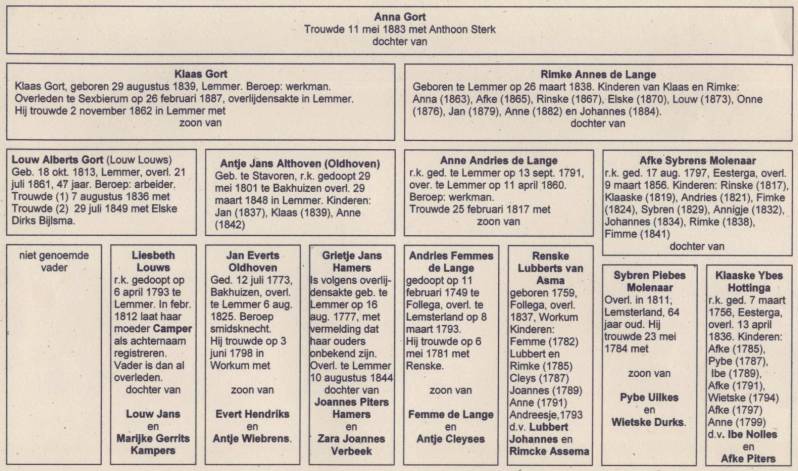 1.3.5. Anthoon Sterk, geboren te Lemmer op 9 maart 1861. Zoon van Gerardus Sterk en Meintje Theodorus Neits. Hij trouwde op 11 mei 1883, 22 jaar oud, te Lemmer met Anna Gort, geboren te Lemmer op 26 juli 1863, dochter van Klaas Gort en Rimke Annes de Lange. Anthoon vertrekt vanuit het ouderlijk huis in de Benedenschans naar wijk 1 nr. 30, vermoedelijk was dat een huisje op de Nieuwedijk in de buurt van zijn schoonmoeder.