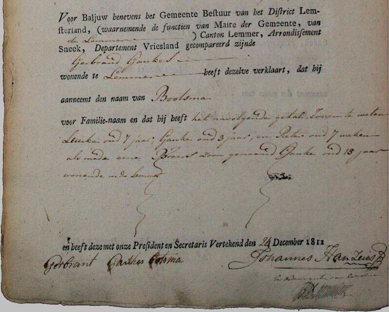 Rond 1811 is de achternaam verplicht verordening van Napoleon. Op deze akte is te zien dat Gerben die hier inmiddels Gerbrand genoemd wordt de naam Bootsma aangenomen heeft.