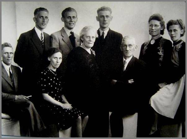 Foto van Marga de Lange-Bender. Staand: Rinze, Wiebe, Tjalling, Jansje en Janna. Zittend: Jan, Hiltje Gepke en Rinze Visser.