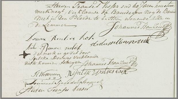 Steven Franses Visser, is hier op een akte te zien als getuige bij een huwelijk: 18-03-1813 Bruidegom: Douwe Rinkes Kok, leeftijd 30, vader: Rinke Douwes Kok, moeder: Ytske Douwes. Bruid: Antje Bouwes Verbeek, leeftijd 25, vader: Bouwe Pieters, moeder: Stijntje Willems.