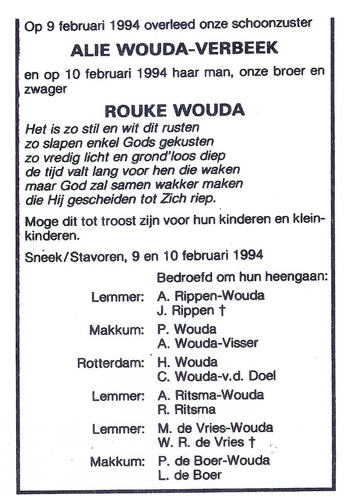 1.3.2.4.1 Antje Wouda is geboren op 03-05-1908 in Lemmer, dochter van Peke Wouda (zie 1.3.2.4) en Geertje Kuipers. Antje is overleden op 12-11-2002 in Lemmer, 94 jaar oud. Antje trouwde met Jan Rippen. Jan is geboren op 28-04-1901. Jan is overleden op 01-11-1972, 71 jaar oud.