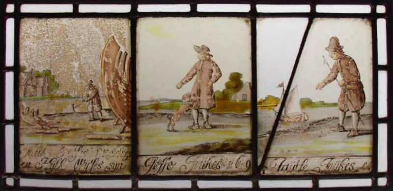 Achterin het museum, in een vitrine tussen antiek gereedschap, daar hangt het. Weer een jaartal, maar onvolledig nu: 169... Dat raam stamt uit Joucke's tijd... Zou het ook ter ere van het nieuwe huis zijn gemaakt, net als het wapen in de gevel? Er staat een drietal figuren op het gebrandschilderde glas, in bleekgroene kleuren. De meest linkse daarvan moet Joucke zijn, hij is bezig een stuk hout met een dissel te bewerken. Naast hem een jongeman tegen wie een hondje opspringt - een jeugdig iemand dus - en daar weer naast een jongen met een pikhaak in zijn hand die langs de waterkant met een zeilbootje aan het spelen is. Ze dragen allemaal een hoed.