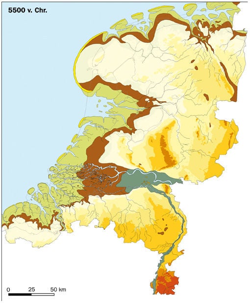 Zo ontstond geleidelijk de N. helft van de Zuiderzee en werd de doorgang Enkhuizen Staveren verwijd. Ook trad afslag op aan de O. kust van de kom en het water werd brak of zout. Veel groter landverlies werd voorkomen, doordat de mens ingreep met dijkbouw (ca. 1000) en het afdammen van open binnen wateren (Amstel, Zaan, Purmer Ee, Spaarne etc.) In die dammen werden sluizen gelegd en dit waren de aangewezen plekken voor een handelsnederzetting. Nog later, vooral in de 17e eeuw, gaat men in de aanval en verovert door inpoldering grote meren, die tot de vruchtbaarste streken gaan behoren.