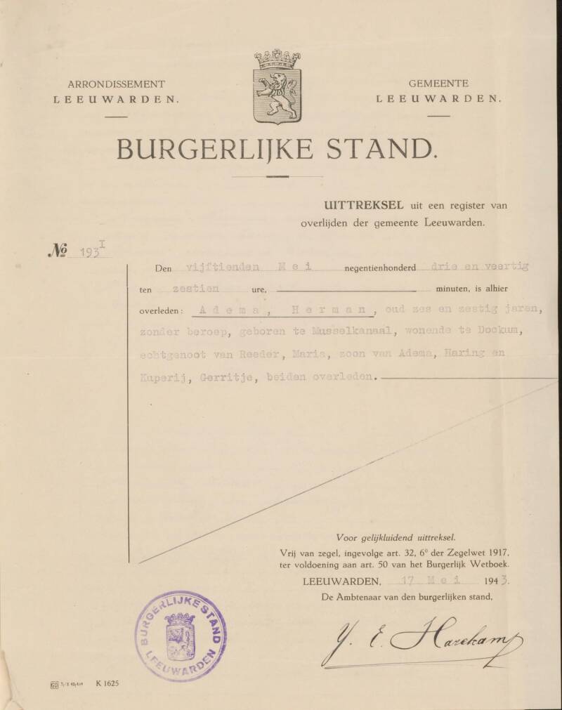 Herman Adema, is door de Duitse bezettingsmacht geëxecuteerd bij de April-Meistaking. De Duitse patrouille opent het vuur op samenscholingen op 3 mei 1943 te Dokkum, waar hij bij het brugwachtershuisje aan de Woudpoort in zijn woonplaats Dokkum zwaargewond raakte. Hij werd overgebracht naar een ziekenhuis te Leeuwarden. Daar overleed hij op 15 mei 1943 aan zijn opgelopen verwondingen.