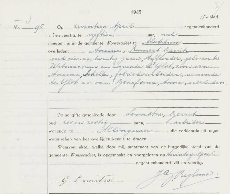 Rinnert Gerrit Anema, (Stoffeerder) geboren op 24 februari 1921 te Witmarsum, overleden op 17 april 1945 bij Wons.