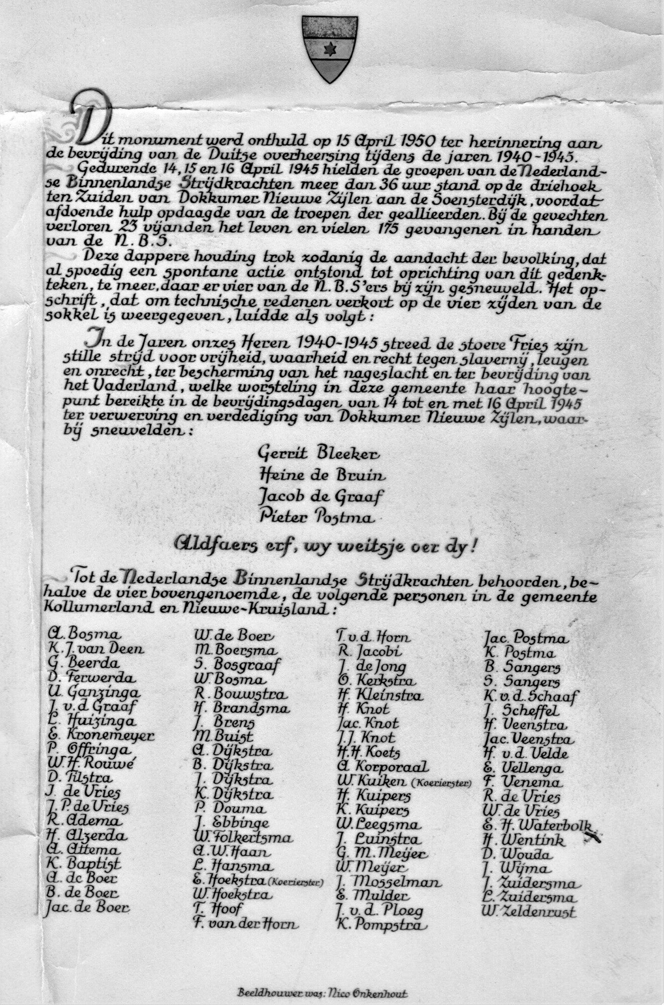 De lijst van de foto met 69 namen is vergeleken en gecombineerd met de namenlijst op het op 15 april 1950 onthulde monument bij Dokkumer Nieuwe Zijlen waar 86 namen op staan.