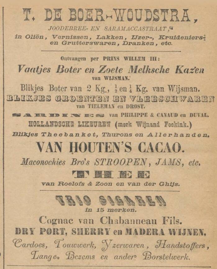 De verkoop van boter-in-blik werd zo een groot succes dat het assortiment werd uitgebreid met cacao (Van Houten), vaatjes boter (van Wijsman), blikken groente en vleeswaren (van Tieleman en Drost), likeuren (van Wijnand Fockink), jams, thee, sigaren, cognac, port, sherry, Madeira wijnen, maar ook alle soorten touw, bezems, borstels, stoffers, oliën, vernissen en lakken.