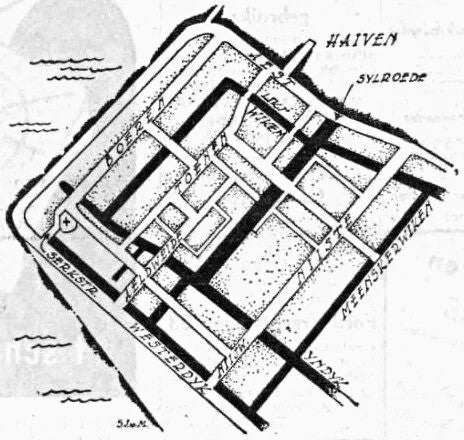 HINDELOOPEN IN 1950: Tussen Boeren en Toenen loopt de Houswiken, tussen Toenen en Niiste de Sylroede, langs de Westerdyk de Westerfae(r)t en van de Sylroede voorbij de Meenskerwiken de Aesterfae(rt). De straat tussen Boeren en Toenen is de Sierkesteager, die tussen Toenen en Niiste de Skoelesteager. Het kruisje geeft de plaats van de Grate Serke aan. Van de kerk naar het Zuiden loopt parallel met de Westerdyk de Niije wei.