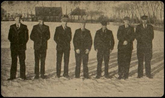 Het bestuur der jubilerende ijsclub v.l.n.r. Tj. Sonsma, M. de Jong, A. Polma, voorzitter P. vd. Ploeg, penningmeester G. Tj. Franckena, baancommissaris J. van der Meer en F. Visser secretaris.