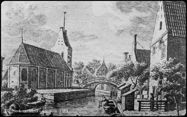 Ook is het van buiten met een gracht omgeven, over welke onderscheidene bruggen liggen, die den toegang daartoe open stellen. Aangezien, uit hoofd van deze verwarde plaatsing, iemand, die te Molkwerum gelogeerd is, wanneer hij buiten het vlek gaat, het huis, waarin hij zijn intrek heeft, bezwaarlijk weder vinden kan, noch het hem, door benoeming van enige straat, kan worden aangewezen, zoo zag men vroeger, aan de ingangen doorgaans jongens, die zich aanboden, om zich voor wegwijzers te laten gebruiken. Vandaar heeft dit Molkwerum gelegenheid gegeven, om van zekere zaken, die verward gesteld zijn of verward en zonder orde worden uitgevoerd, te zeggen: dit is of dat gaat op zijn Molkwerums; gelijk ook ene manier van dammen, waarin de schijven, niet alleen in ene schuinse richting, maar ook rechts en links, alsmede naar boven en naar beneden slaan, hetgeen het aanzien van een verward dammen geeft, Molkwerums-dammen genoemd wordt.