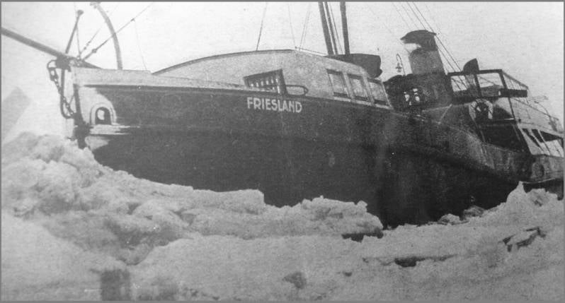 Erger was "De Friesland" er aan toe. Dit vaartuig voer zoals gezegd ruim vijftig meter achter de beide andere schepen. Toen het ijs begon te kruien werd "De Friesland" omhoog getild en volkomen door het ijs ingedrukt. In de machinekamer sprong een stoomleiding. Het gelukte de machinist de heer De Jong slechts met moeite op het allerlaatste ogenblik uit de machinekamer te vluchten. De ketel liep onmiddellijk leeg zodat ook het vuur gedoofd moest worden. Het schip maakte op vele plaatsen water en het was niet mogelijk de lekken te stoppen.