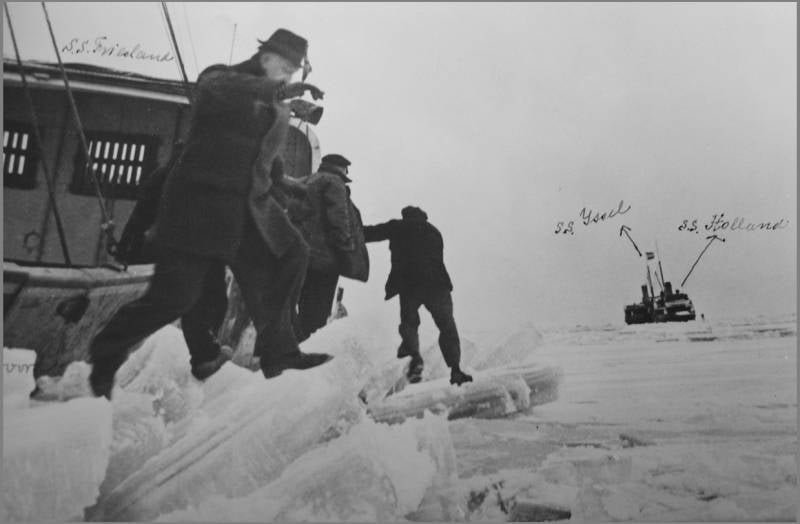 De opvarenden van de "Friesland", die tijdens de tocht op het IJsselmeer in het kruiend ijs beklemd raakte, verlaten hier het schip, om zich naar de eveneens in het ijs vastzittende "Holland" en "IJssel" (op de achtergrond) te begeven.