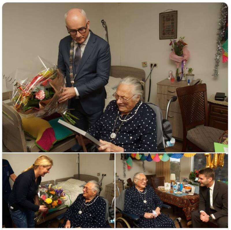 Afgelopen Maandag was het feest in Verzorgingshuis Suderigge. Mevr. Wouda ook wel Pietsje van Peke genoemd is 100 jaar geworden. Jaren lang heeft ze een groentezaak in de Schans gehad en waar kinderen die met hun ouders in de winkel kwamen een snoepje van Pietsje kreeg. Ter ere van haar verjaardag kreeg ze nog een bezoekje van de Burgermeester Feenstra die een prachtig bos bloemen en de geboorte register van Mevr. Wouda.