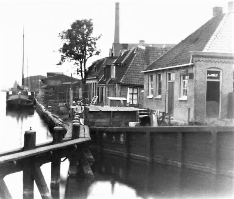 - Mien v.d. Meer-v.d. Wolf: Mijn opa, Johannes v.d. Wolf, woonde in het eerste huis met zijn gezin. Hij heeft hier gewoond tot aan zijn dood met zijn dochter Elizabeth. Zijn vrouw was nl. jong overleden. Na zijn dood, heeft Elizabeth er nog gewoond met kostgangers. Ongeveer in 1941 is het gezin van Harmen v.d. Wolf er komen wonen. In de woning ernaast hebben gewoond: De grootmoeder van Harmen (van moeders kant), Oate de Boer. Daarna een oom en tante, oom Harmen de Boer en tante Makke. Daarna een Lageveen, daarna Luite Dam, met zijn gezin (hij was bij de sociale dienst), dit was in de oorlogstijd. Daarna fam. T. Huitema. Nadien is het als toonkamer van kachels gebruikt en is de bovenverdieping bij het huis van Harmen gekomen. Bij de brand van de houtmolen hebben deze beide woningen praktisch geen schade opgelopen. In de nacht van de bevrijding werd Harm getroffen door een dum-dum, die zijn bovenbeen heeft verbrijzeld. Daardoor heeft hij een stijf been gekregen. Zijn aangepaste fiets had twee trappers, waarvan de ene een stilstaande cranck had (deze cranck is nog in ons bezit).