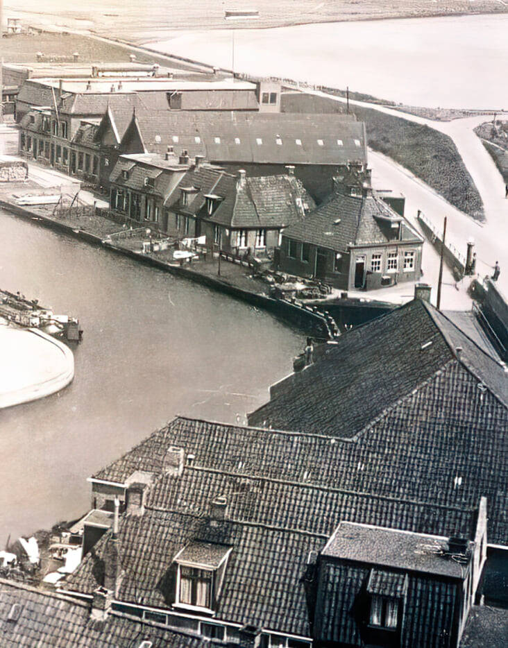 - Truus Goessen-Huitema: ‘Direct naast de werkplaats woonde Harm met zijn gezin. Nadat mijn pake, Teake Huitema, zijn boerderij had verkocht hebben mijn pake en beppe hun laatste jaren in het huisje ernaast gewoond. Zo heeft het er in de tijd van mijn vaders jeugd uitgezien. Ik ben in de oorlogsjaren vaak op de boerderij geweest, maar wat in mijn geheugen zit is dat in die tijd ook al de muur en het hekwerk bestonden. Maar later in het huisje aan de Zeedijk 2 was het allermooiste. Vlakbij de houtmolen... En het werk in de smidse was ook altijd interessant. Ik heb er vaak gelogeerd in het kamertje boven. Daar was een kleine bedstee, heel gezellig.’