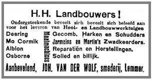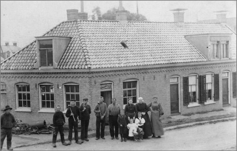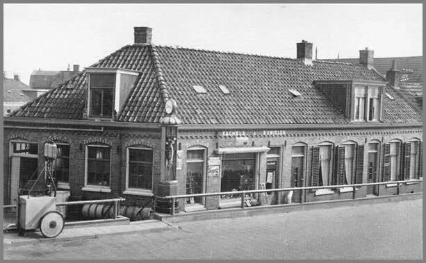 - Mien v.d. Meer-v.d. Wolf: De toegangsdeur links was de toegangsdeur naar de smederij. Via de smederij kwam men in de winkel. Veel later is deze deur etalage geworden en is er rechts een winkeldeur gekomen. Reclame werd gemaakt voor Torpedo rijwielen (De rijwielen en schrijfmachinefabriek Torpedo Werke te Frankfort a/Main) en Hevea banden. Vóór de smederij een "Shell" benzinepomp.