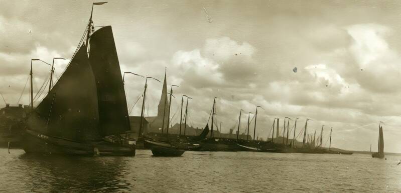 Op de voorgrond een schip met veel mensen. Op de achtergrond de R.K. kerk, de huizen boven de 'baan', de nettenmakerij van Jan Pen en rechts de rokerij van S. A. de Blauw en links die van de Jager. Op de haven zijn de palen voor het drogen van de netten te zien. In de Vluchthaven liggen een aak en een botter voor de wal.