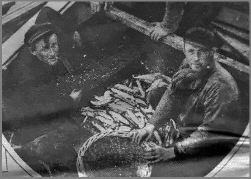 Links op de foto ziet u Meinze de Vries en Steven Visser, beiden werkzaam bij Jan Mulder als respectievelijk eerste knecht en derde man. De foto toont hen tijdens het lossen van haring. Op dat moment werd een korte pauze genomen om hen te fotograferen. Vervolgens werd de mand verder gevuld, waarbij vijftig worpen van vier haringen werden geteld. Dit werd gezamenlijk een "tal" genoemd, wat neerkomt op een totaal van tweehonderd stuks.