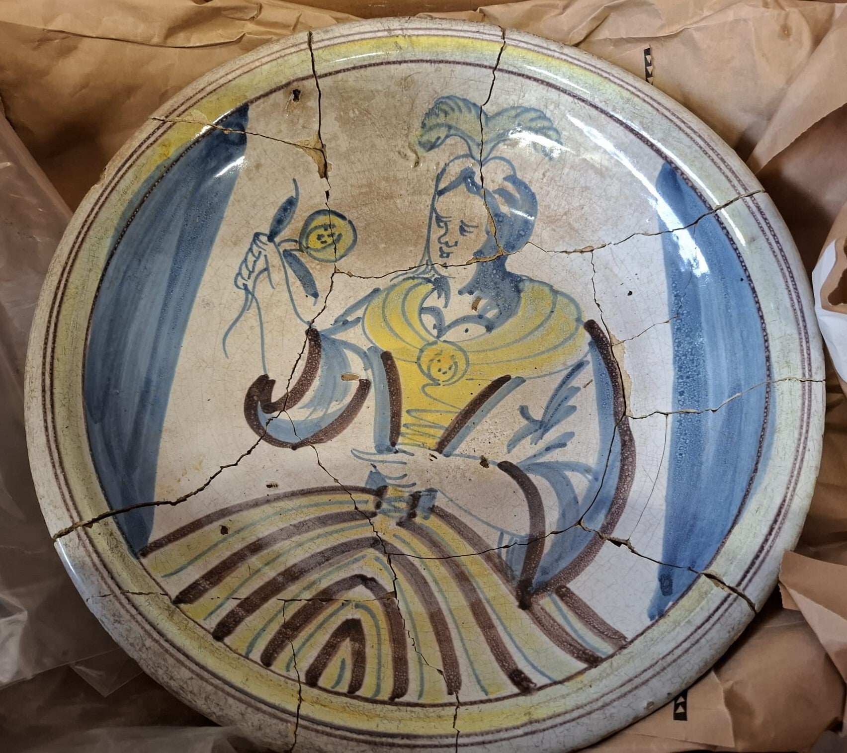 Aardewerkvondsten. Links: Majolica-bord (ca. 17e eeuw). Midden: Een klein steengoed kruikje. Links: één van de vele grotendeels complete vondsten. Foto’s: Lisa Terpstra (links, midden) & André Pleszynski (rechts), Movares.