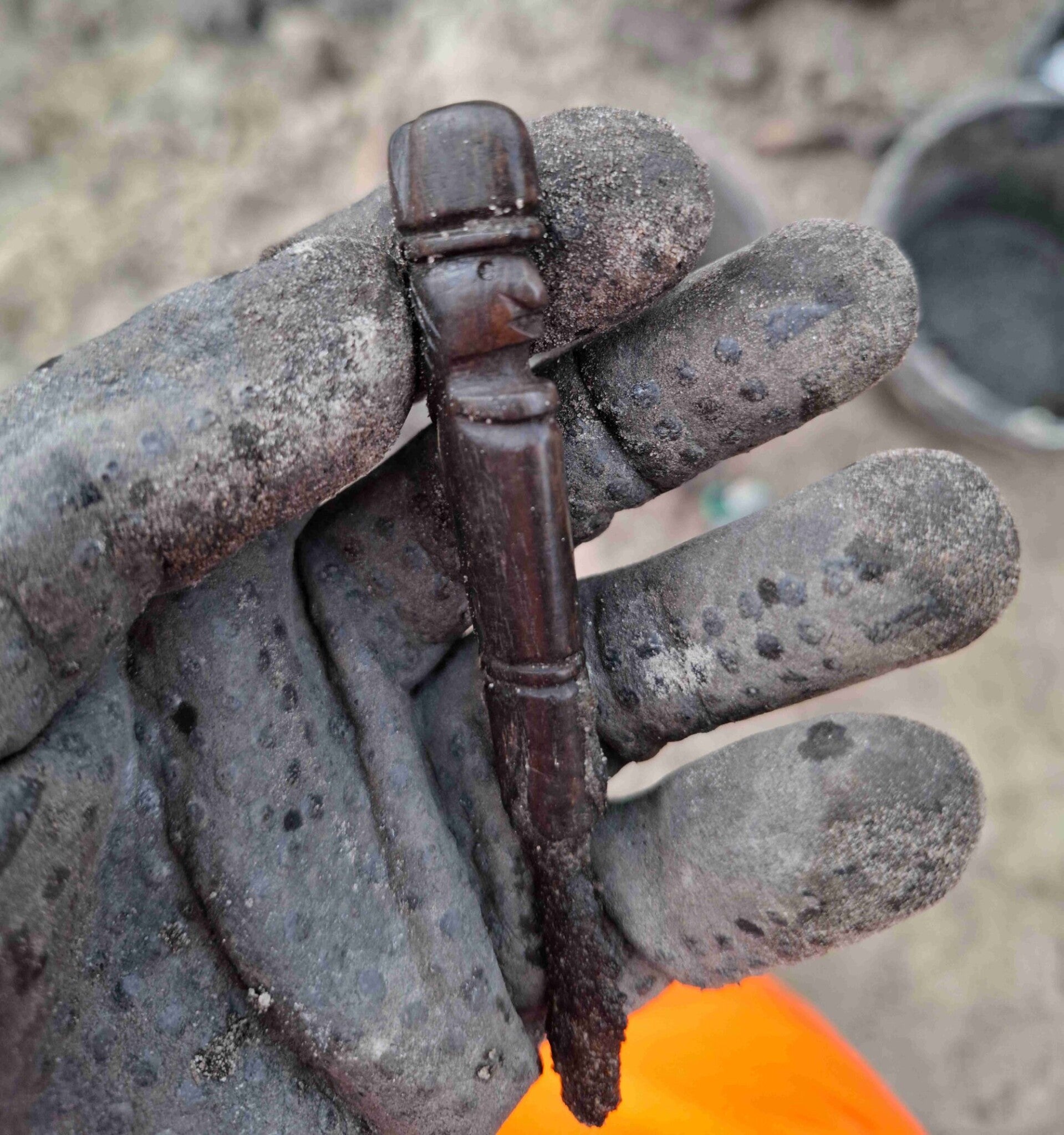 Ten slotte een houten mesheft met een gezichtje er in gegraveerd. Gemaakt van erg fraai en hard hout. De datering is nog onbekend, waarschijnlijk rond de 17e-18e eeuw. Dit moet een uniek en persoonlijk object geweest zijn, wat het zo bijzonder maakt. Foto: Lisa Terpstra, Movares.