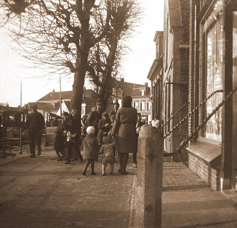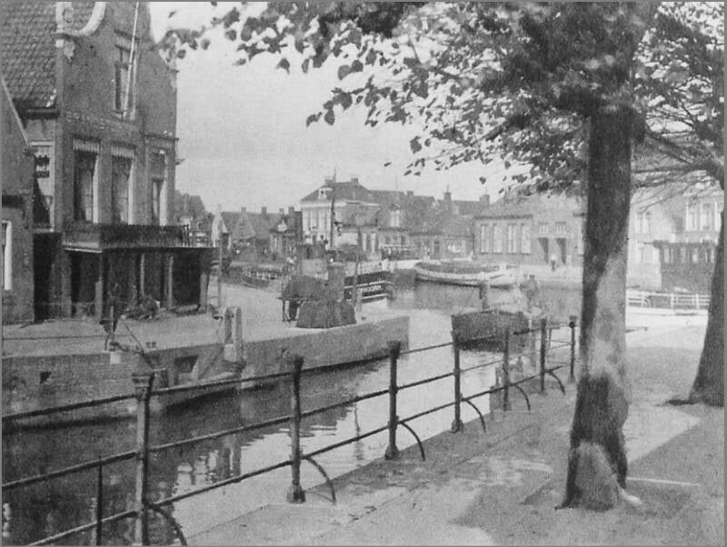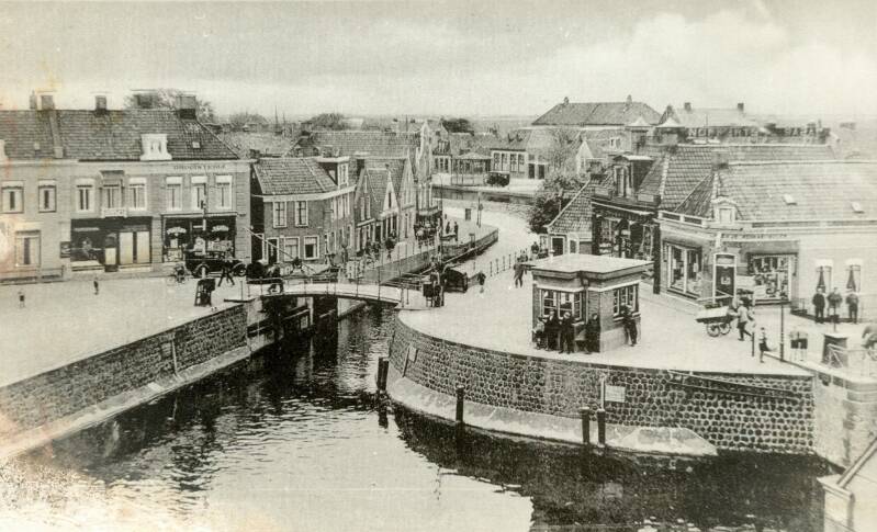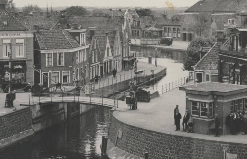 Voor de deur van Zwart loopt iemand met een viskar. Dat lijkt mij Andries Visser, op weg naar zijn standplaats naast de brug op de Schulpen. Op de voorgrond het brugwachter hokje met wat mensen er omheen. De beide mannen aan de waterkant zouden wel eens twee van de gebroeders Rottiné kunnen zijn. Aan de walmuur hangt een ladder om gebruikt te worden voor het geval er eens iemand te water zou raken. Men was toen nog beter op een ongeval voorbereid dan tegenwoordig, want vorige week hoorde ik dat bij de brug helemaal geen reddingsmiddelen voorradig zijn.