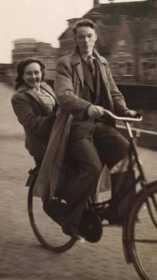 Foto van Berend Geert Pietersma, Mijn vader Ate Pietersma op de fiets met mijn moeder Antje Stilma door de Lemmer.