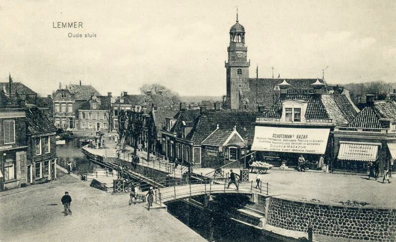 Naast de bakkerij van Loen staat nog een hokje. Naar ik meen was dat in het verleden het onderkomen van de nachtwachten. In later jaren werd dit gebouwtje voor 50 gulden door Hendrik van Loen van de Gemeente Lemsterland gekocht. Voor een beter uitzicht en een wat groter tuintje. Dan zien we Noppert's bazaar, een zaak waar praktisch geen nee te koop was. Op de hoek van de sigarenzaak van Piet Zwart, met de toepasselijke naam "t Hoekje" Daar kon men ook terecht voor sportartikelen. Dat zal in die jaren wel hoofdzakelijk het tenue van de V.V. Lemmer zijn geweest en misschien een paar voetballen.