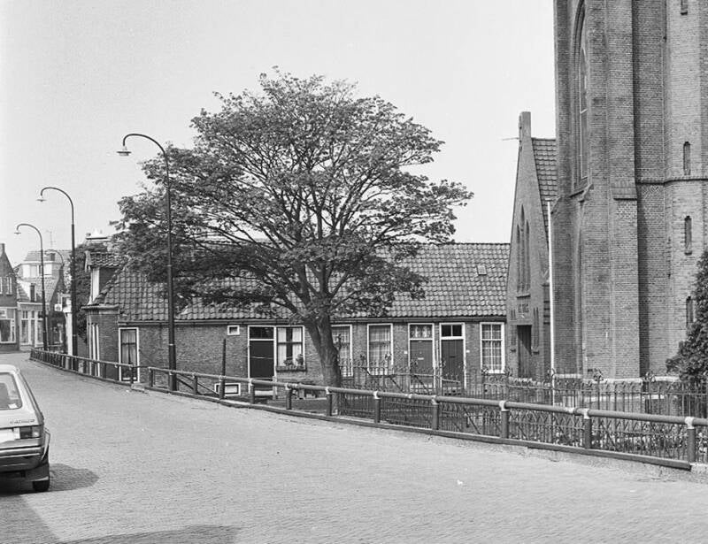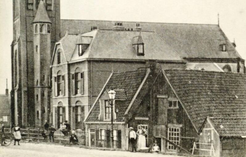 Deel van de Schans, thans de ingang vanuit de richting Oosterzee. Op de voorgrond staan een paar oude visserswoningen en de rooms-katholieke pastorie met kerk, welke in 1901 is gebouwd. Ook hier liet de jeugd van haar belangstelling blijken.