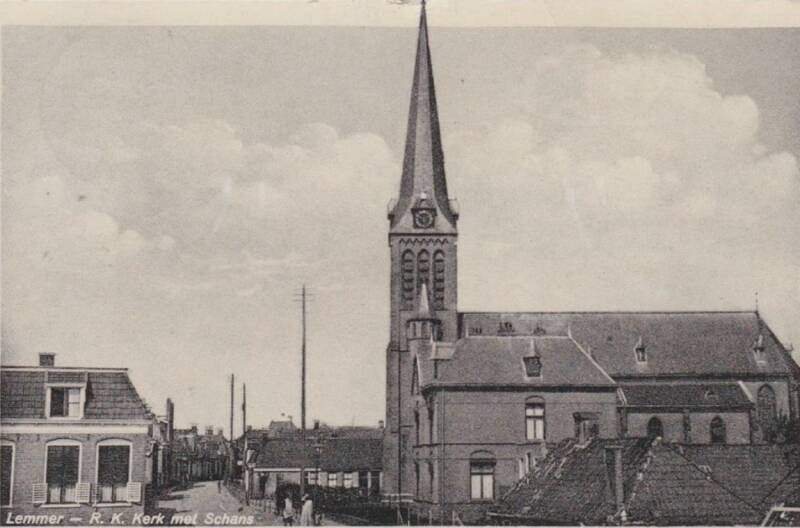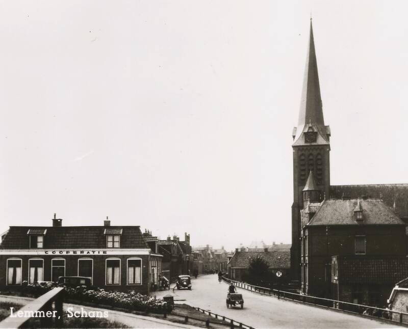 Lemmer 1925: Links de visrokerij van Sjeerp de Blauw, voor de rokerij staat een klein hok, dat diende als nachtverblijf voor de schapen die op de dijk graasden.. Geheel rechts is nog een gedeelte te zien van de boerderij van de familie Huitema. Een deel van de woningen in de Beneden Schans is reeds lang verdwenen. De rooms-katholieke kerk was toen tien jaar oud.