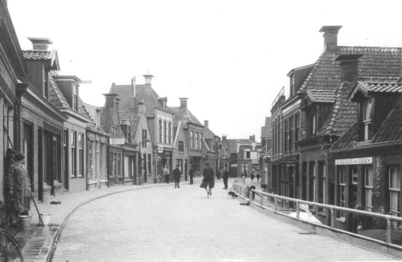 Een opname van de Schans. Genomen vanuit de richting van de spuisluis. Links op de voorgrond de vroegere hang van Seerp de Blauw. Toen in handen van de Coöperatie die er een bakkerij in had. Lang heeft dat niet geduurd.