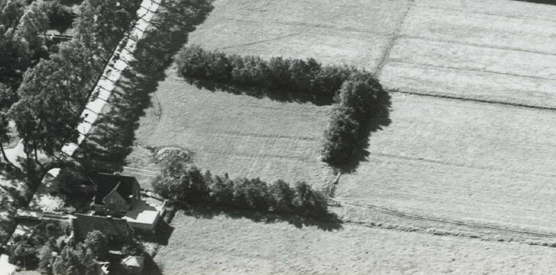 De boerderij op de plaats van de garage van Aukema, nu Witteveen. Achter die boerderij een aangebroken kuilbult. Daar heeft indertijd Jan v.d. Bijl geboerd. Even verder een gebouw met de vorm van een boerderij. Daar waren vier woningen in gemaakt en Witteveen had daar ook een garage in. Van de Parkstraat is nog niets te zien. De boerderij die dan volgt is die van De Jong. Verder veel bomen en groen.
