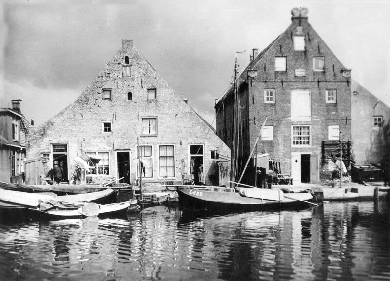 Achterkant van panden Turfland: In het linker pand, woonden drie gezinnen. Buiten zijn de oude hûskes nog te zien.