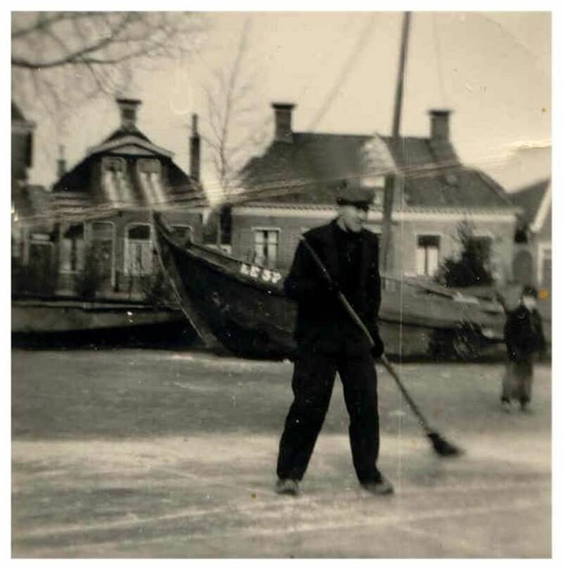 Foto van Dicky van der Veen-Thijsseling: Dit is mijn pake Durk Thijsseling die op het bevroren Dok staat te vegen, deze foto is circa 1950/60 gemaakt.