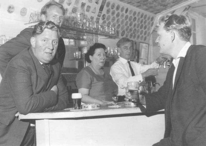 Foto van Meintje Koper Visser: Piet en Mientje van der Werf staan achter de bar. Op de voorgrond mijn vader, Jelle Visser, met achter hem Sake Schotanus en Rinse Visser.