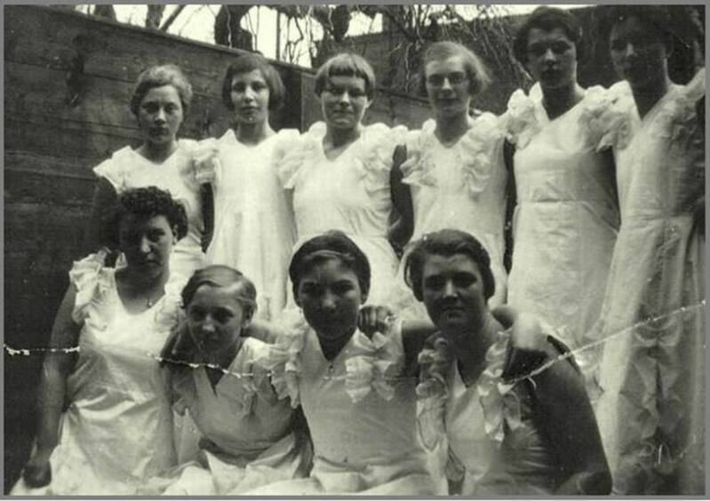 Leden van gymnastiekvereniging DOS. Op de bovenste rij van links naar rechts staan mevrouw Rina Feenstra, mevrouw Annie van der Tuin, mevrouw Hielkje Bakker, mevrouw Tjitsche Schokker, mevrouw Elly Hooiring en mevrouw Geesje Wierda. De onderste rij bestaat uit mevrouw Antje Bootsma, mevrouw Aaltje Visser, mevrouw Geertje van der Meer en mevrouw Trijntje Hooiring.