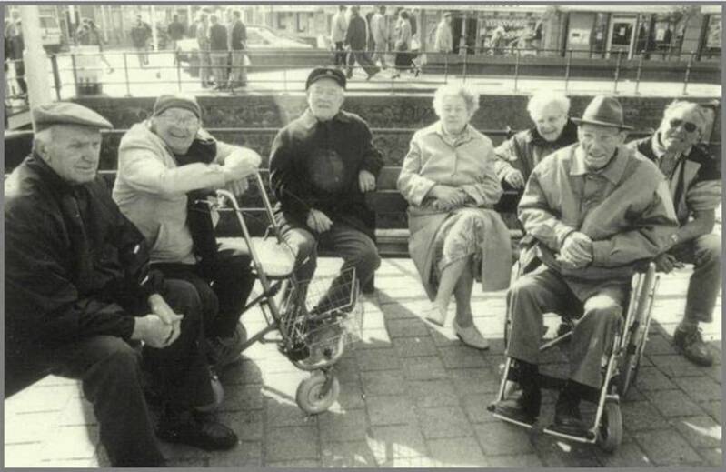 Een groep inwoners van Lemmer is te zien op de bankjes nabij de brug, met op de achtergrond de Schulpen. Op de etalageruit van Expert Bijlhout wordt in duidelijke bewoordingen aangegeven dat er een verbouwingsopruiming plaatsvindt. Op de bankjes, van links naar rechts: de heer Thomas Visser, mevrouw Jenny Bondiëtti, de heer Leeuwke Bootsma, mevrouw Joltje (echtgenote van de heer Thomas Visser), mevrouw Jantje Bijma, de heer Jaap Visser en de heer Gerben Feenstra.