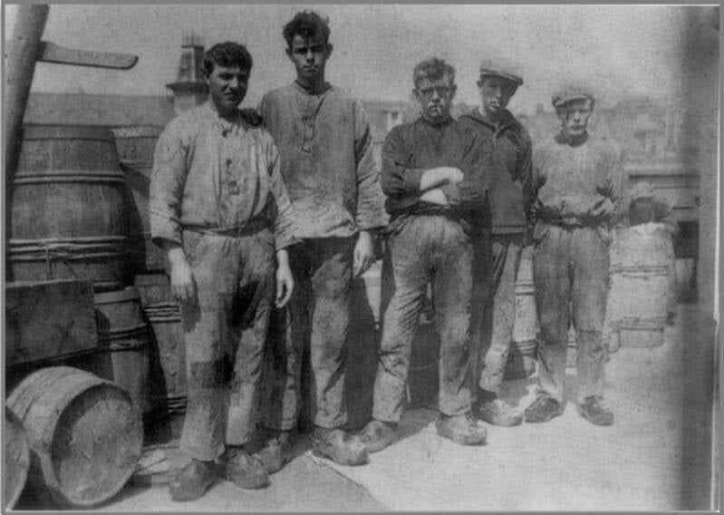 Foto van Leeuwke Bootsma, gemaakt aan de Binnenhaven, vermoedelijk nabij de opslagplaats van De Rook. Aan de overzijde is duidelijk het torentje van het voormalige tramstation te zien. Het betreft hier duidelijk een groep werkenden, vastgelegd midden tussen de vaten en ankers waarmee zij hun werkzaamheden verrichtten. De namen van de afgebeelde personen zijn genoteerd op de achterzijde van de foto, maar helaas betreft het uitsluitend voornamen, die door de jaren heen, geschreven in potlood, grotendeels onleesbaar zijn geworden. Voor zover leesbaar, luiden de namen: J. Kooi, Rikus, Willem, Teunis en Roelof. Het onderschrift, dat nog redelijk goed te onderscheiden is, vermeldt: ‘allemaal Lemsters’.