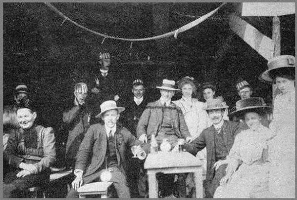 De eerste persoon, zittend links op de foto, is mevrouw Oate Jette. De man die naast haar is afgebeeld, is niet geïdentificeerd. De derde persoon, zittend achter de tafel, is de heer Nieuwenhuis. Hij was woonachtig aan de Langestreek in het Vredespaleis en bekleedde de functie van commissaris bij de Groningen – Lemmer Stoomboot Maatschappij, verantwoordelijk voor de exploitatie van de nachtboot naar Amsterdam. De vierde persoon op de foto is de heer Gorter, die werkzaam was op de secretarie. Hij is op jonge leeftijd overleden na een vermoedelijk zware en pijnlijke doodsstrijd. De dame naast hem is een dochter van de hotelhouder Van der Hoff. De meest rechtse persoon op de foto is niet geïdentificeerd.