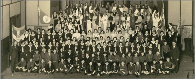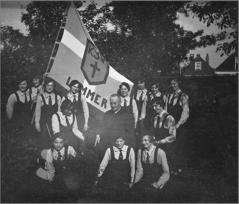 Foto van Klaas Faber: Katholieke Jeugd Vereniging afd: Lemmer, met vlag en pastoor?