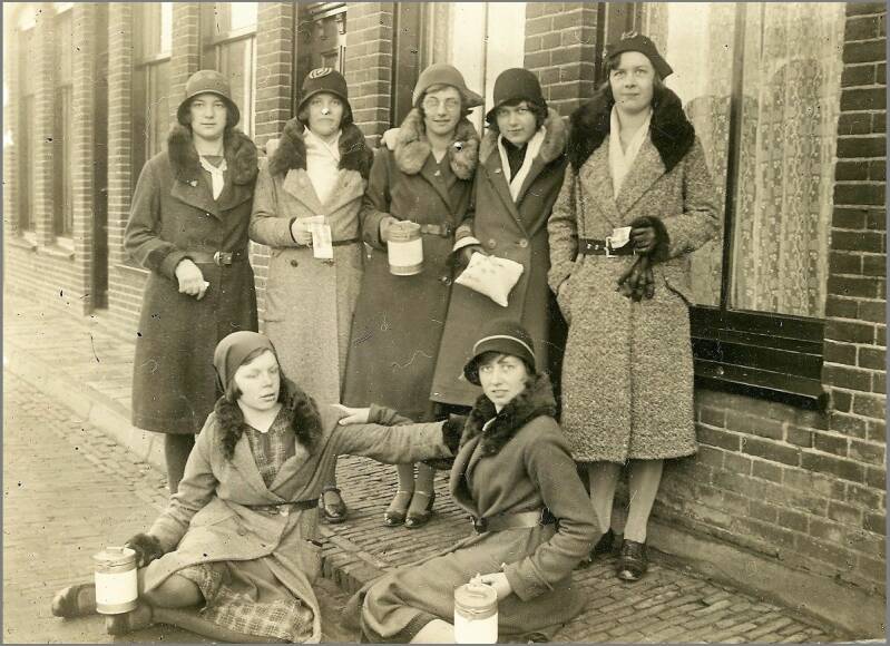 Foto van Klaas Faber: Een foto met Saakje Bosma, in het midden tussen mede collectanten. Verder zien we van links naar rechts: Eelkje Beljon, Ida Nijholt, Saakje Bosma, Lies Baersma, Saakje v/d Berg: Zittend: Ida v/d Berg en Geesje Beljon.