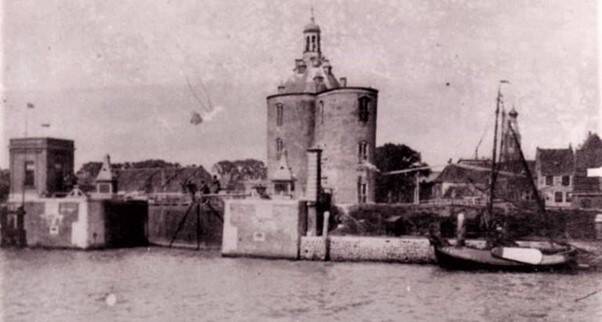 Enkhuizen, bij de (gesloten) sluis en de Drommedaris. Rechts in de Buitenhaven ligt het ijzeren aalbootje EH 9, de Breebanck, die in 1913 bij Scheepswerf ‘Vooruit’ van C. Stapel is gebouwd.