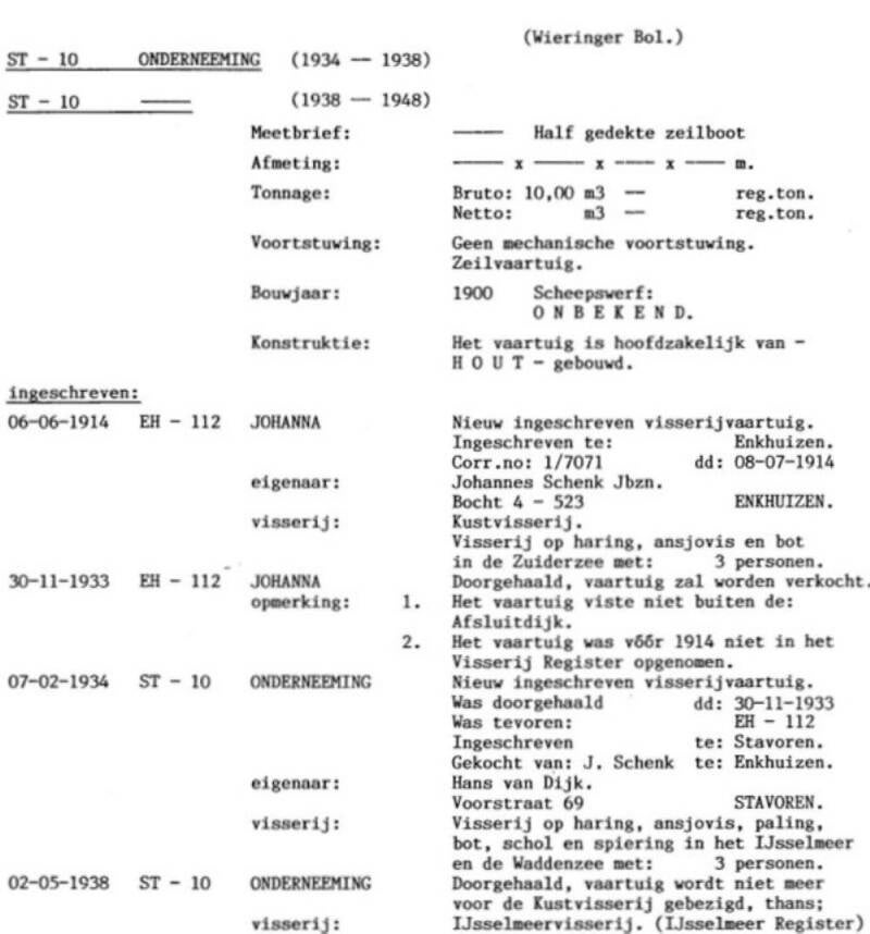 Onderste deel van de oude registratie over de ‘Wieringer bol’ ST 10 uit de archieven van de SSRP Opvallend zijn de afmetingen van 7.28 lang en 2.60 breed. Zwolsman bouwde een aakje van 26 voet voor Schenk. Dat is 26 x 28.3 = 7.36 meter. In 2023 is de lengte 28 Amsterdamse voeten van 28.3 cm.: 7.92 meter. Wellicht veroorzaakt door vervorming en/of meetfouten. Bij de officiële registraties wordt steevast 23 juni 1956 aangegeven dat de LE 107 doorgehaald is uit de visserijarchieven. Dat zal wel kloppen. Het aakje is echter op Hemelvaartsdag, 30 april 1955, verkocht aan G. Bolier volgens het persoonlijk notitieboekje van Bolier en conform het geboortejaar van G. Bolier Jr. in 1955 die als 6 weken oude baby meevoer op het aakje.