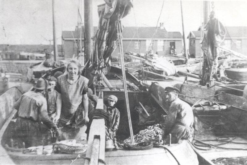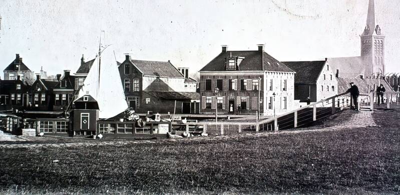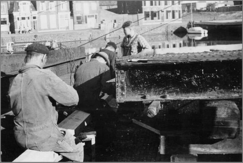 Tevens is een gedeelte van het pand van De Rook waarneembaar. Loodrecht daarop staan drie blokken noodwoningen, evenals een deel van de sluiswoningen. Aan de waterkant ligt de Jan Nieveen, vergezeld door een vaartuig uit de Groningen-serie. In de haven bevindt zich een skûtsje, dat richting de Truitjezijlbrug koerst. Boven de noodwoningen zijn de masten van schepen in de Vluchthaven zichtbaar.