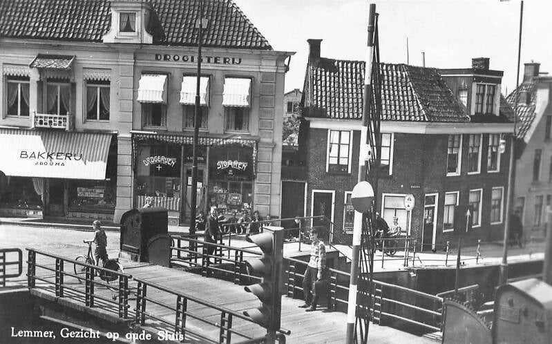 Deze historische foto, toont het centrum van Lemmer in de omgeving van de Blokjesbrug, destijds nog in haar oorspronkelijke uitvoering. De ansichtkaart, daterend uit 1908, werd destijds door de PTT voor een tarief van 2½ cent bezorgd van Lemmer naar Broek bij Joure. Aan de linkerzijde van de afbeelding is een deel van Andringa State zichtbaar. Rechts wordt vermoed dat de familie Boonstra op dat moment al een drogisterij exploiteerde. Het witte vlak boven de deur zou mogelijk een traditionele gaper kunnen zijn geweest, een element dat destijds vaak werd gebruikt als uithangteken voor apotheken.