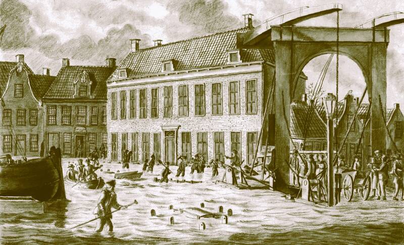 Op 3 februari 1825 werd Friesland getroffen door een hevige noordwestelijke storm, vergezeld door een uitzonderlijk hoge springvloed. Bij Lemmer braken maar liefst vier dijken door, met ernstige gevolgen. Aan de rechterzijde bevinden zich Andringastate en de Blokjesbrêge, terwijl links de locatie "De Wildeman" zichtbaar is.