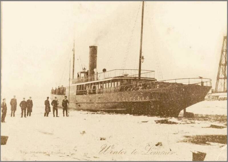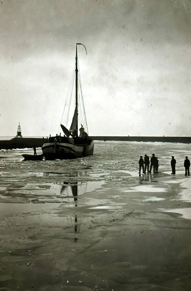 Het passagiers- en goederenschip S.S. 'Bolsward' is vastgelopen in het ijs aan de ingang van de haven. De bemanning begeeft zich rondom het schip.