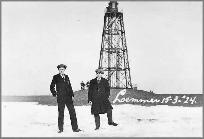 Winter in Lemmer, 15 maart 1924. Een weergave van de vuurtoren, met op de voorgrond links de heer Marten Poppe en rechts de heer Evert Dam. De vuurtoren werd op 23 november 1968 gesloopt. Voor de sloop ontving de gemeente een vergoeding van f.620,-.
