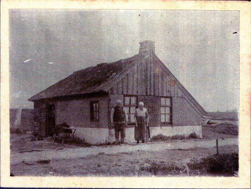 Foto van het huisje van Roelof Slump en Geertje Postma in de Echten-Polder, met het echtpaar er voor. Genomen in ongeveer 1922. (Roel was een zoon van Jan Roels, een oudere broer van mijn overgrootvader Harm.