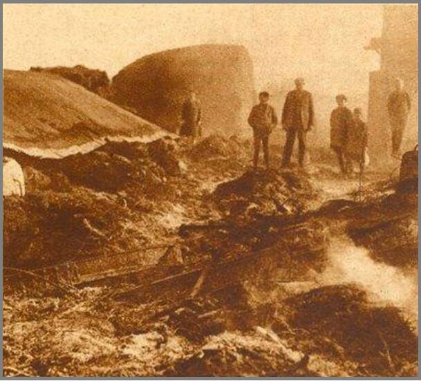 De kapitale boerderij bewoond door den heer J. Krot te Follega, is een prooi der vlammen geworden. 34 koeien en 2 paarden, vielen hier als slachtoffers. Een afdruk van een gedeelte der stal met de half verkoolde lijken der beesten.