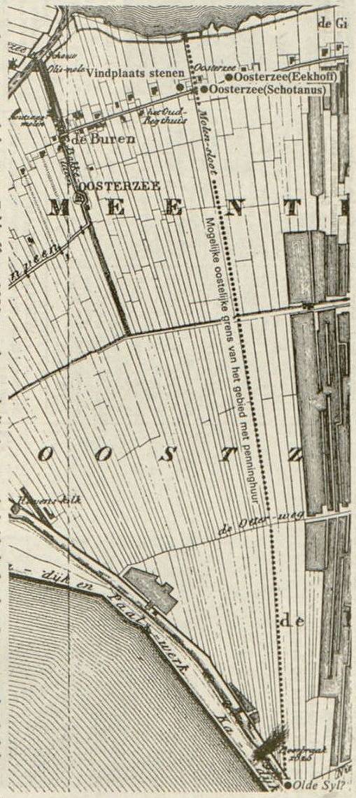 Een fragment van de kaart van Eekhoff van 1850, met daarop de ligging van de beide hofsteden Oosterzee, de vindplaats van kloostermoppen en scherven (van Wytse Strampel) in 1975 en de mogelijke ligging van de in 1543 vermelde Olde Syl én de mogelijke oostelijke begrenzing van het gebied met penninghuur.